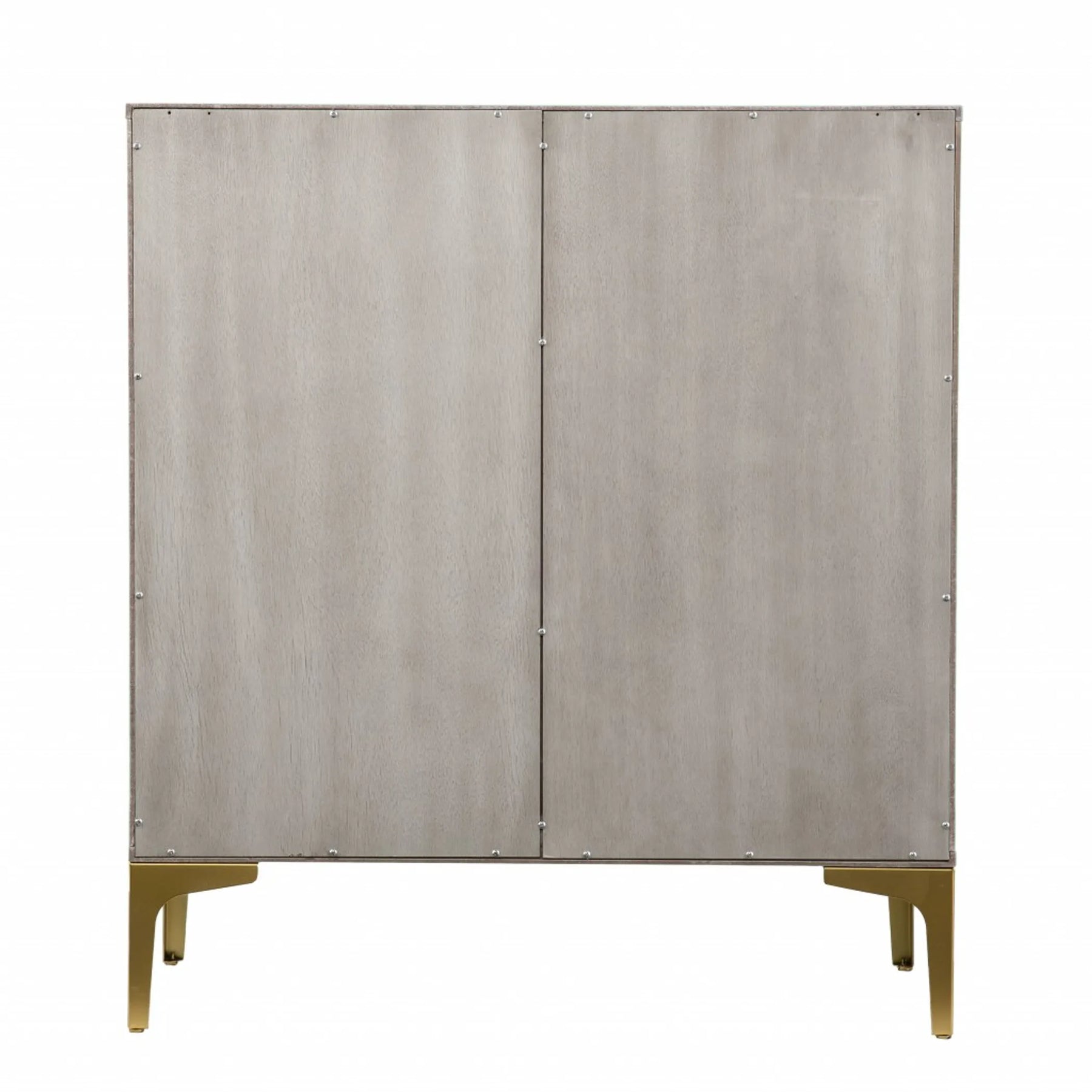 Add some contemporary flair to your space at the same time you add storage and organization opportunity with this Graywash Textured Geo Contemporary Accent Cabinet. The multipurpose storage cabinet features double doors with three shelves inside for ample storage. The gray wash finish has the added bonus of textured triangle panels on both doors and contemporary gold abstract door hardware. Make the most of your living space with this functional yet decorative and fashionable cabinet. 36" x 32" x 15.8"