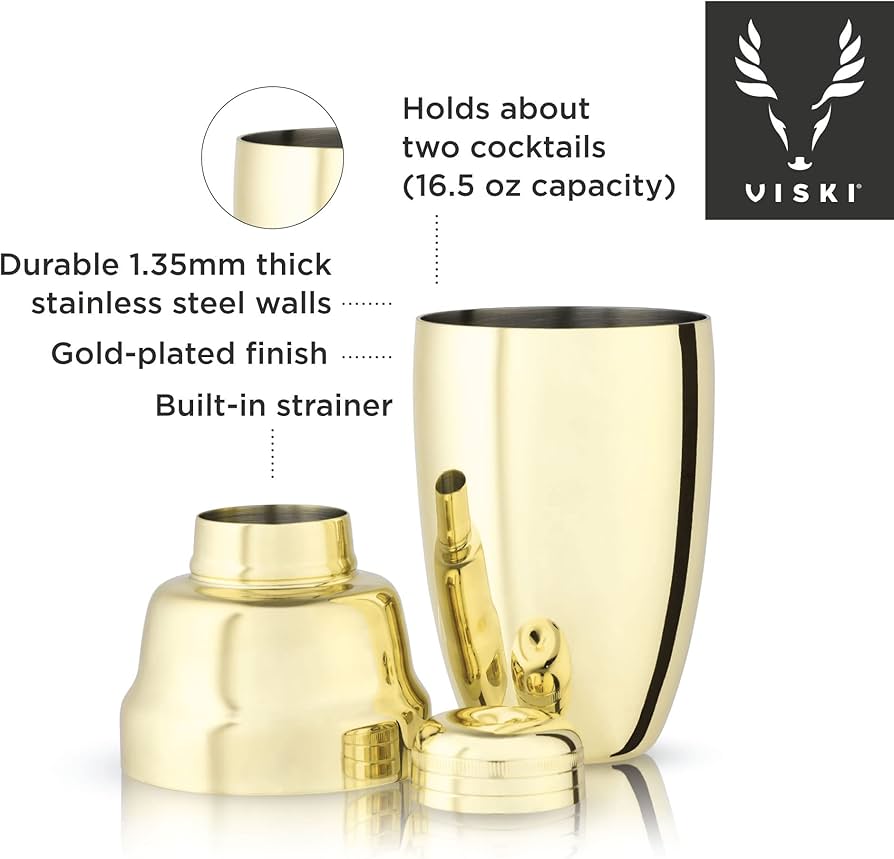 • This substantial gold-plated tool is the cornerstone of any professional bar set.---Accommodates 500 ml (17 oz) comfortably--1.35 mm-thick walls--Gold plated--Built-in strainer--
