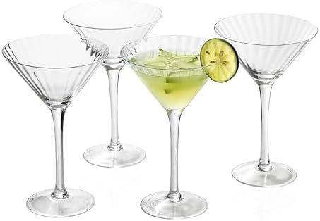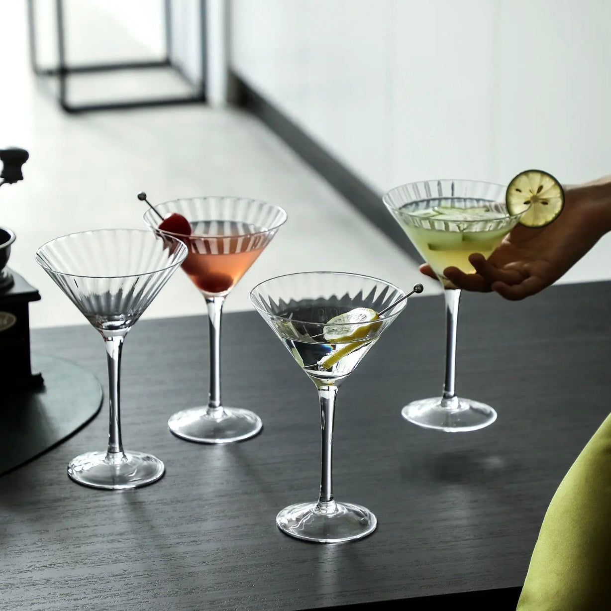 Each of these martini glasses are masterfully shaped and hand-blown by artisans using traditional methods, creating a modern, exceptionally clear body that gracefully showcases your cocktail. Sophisticated with a sparkling radial ray optic finish, the martini glasses add visual interest and high style to the table or home bar. Each glass has a standard V-shaped bowl and ultra-thin rim for you to enjoy every sip, while the elegant long stem fits effortlessly in your hand.